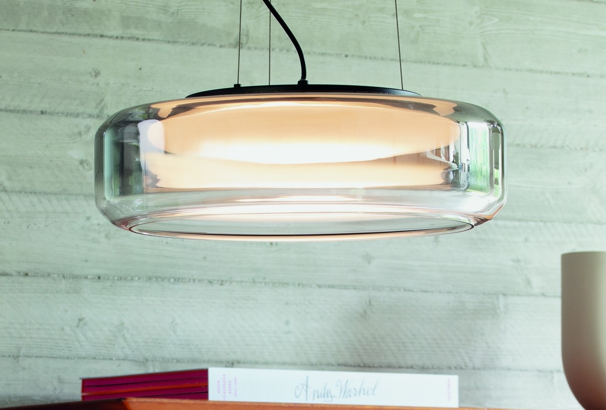 TOPICO lighting suspension. Matt painted metal frame. Double-paned diffuser: acid-etched white interior, transparent exterior with a smokey glass shade at the top.