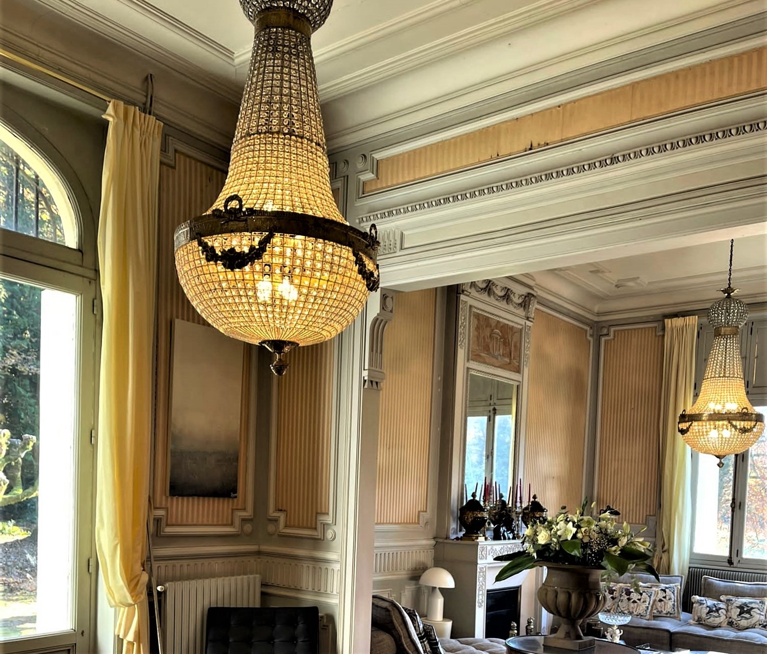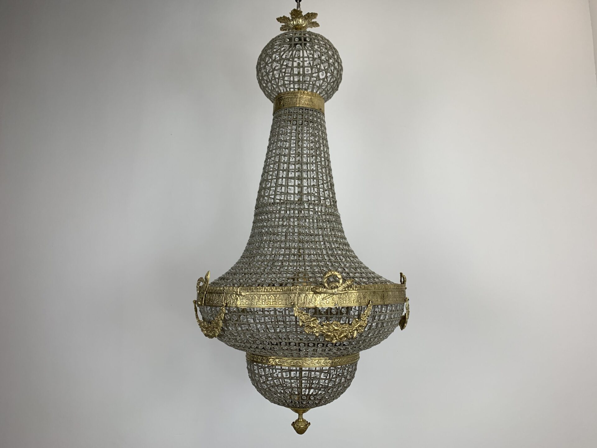 MONTGOLFIERE : inspiración clásica para supensiones de vidrio y latón. 5 tamaños, desde 75 cm de alto hasta 220 cm. Desde 320 € con IVA.