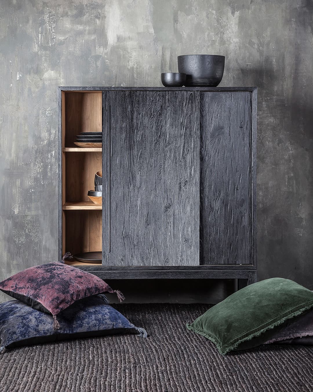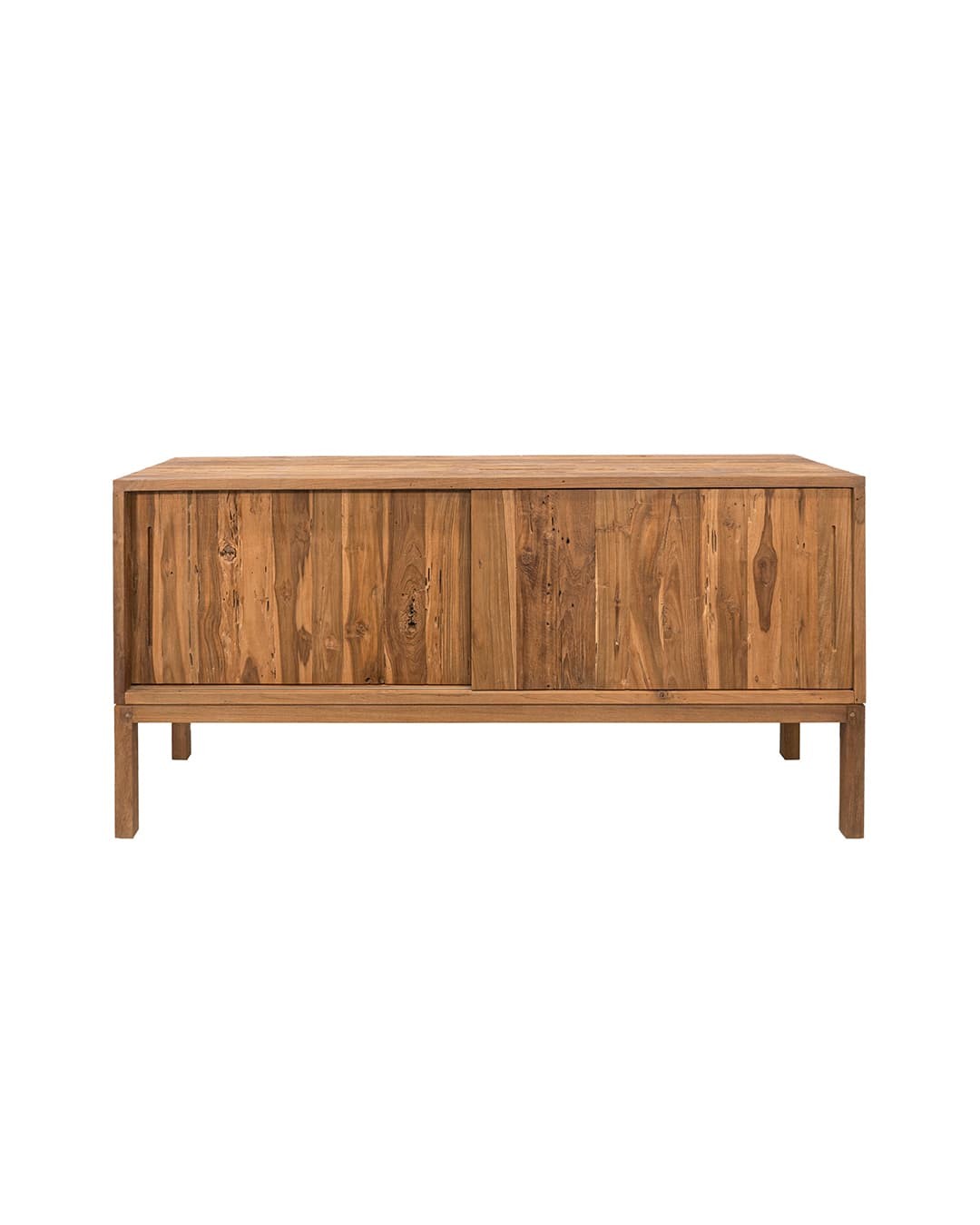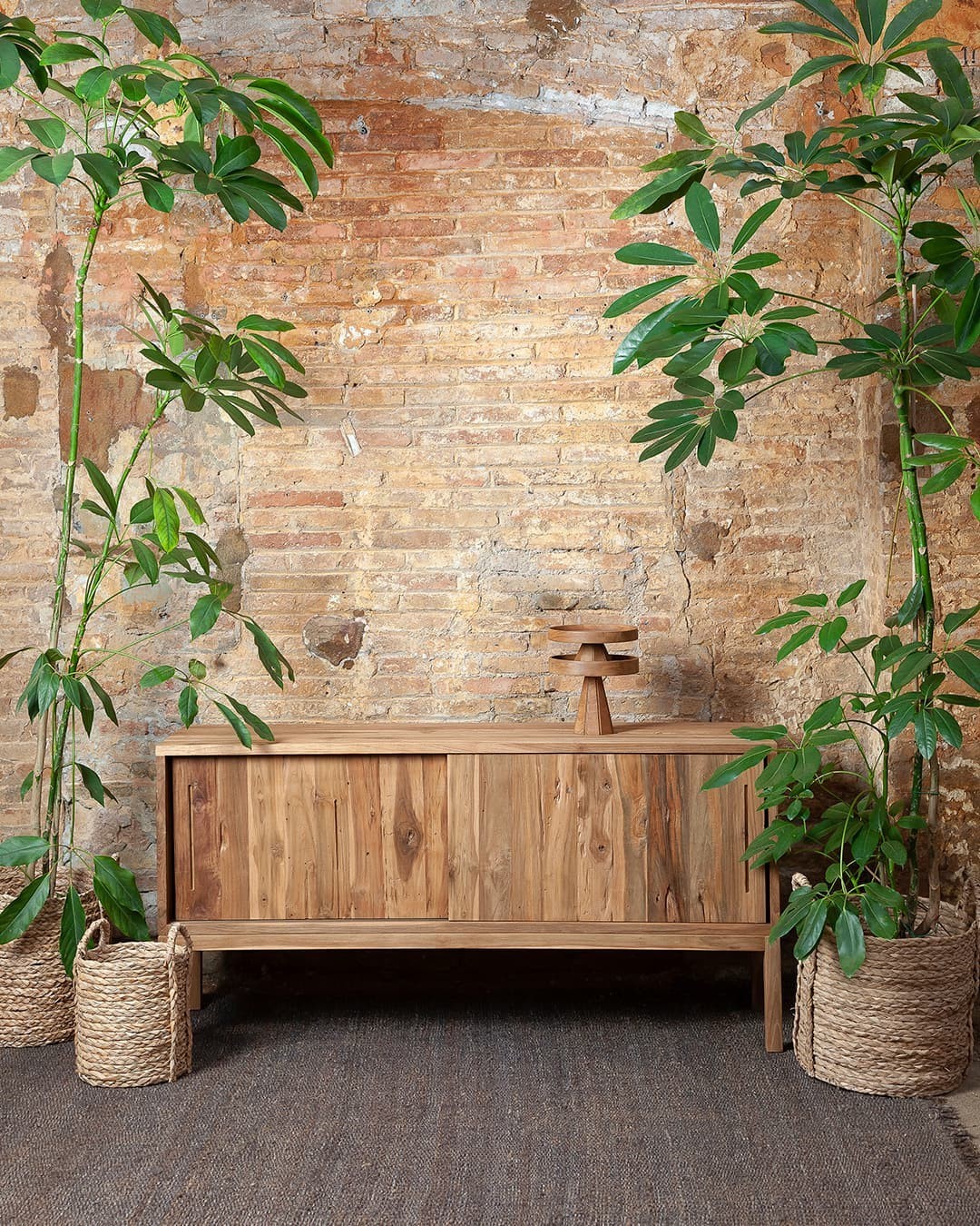 Un aparador horizontal o vertical de madera de teca reciclada natural y estilo rústico, líneas rectas y puertas correderas de estilo japonés, detrás de las cuales se esconde una cómoda y funcional balda, también de madera de teca. Pertenece a la familia EROSI, que se caracteriza por el uso de materiales nobles y sostenibles embellecidos por las inconfundibles marcas de la erosión del tiempo. Disponible en versiones alta y baja.