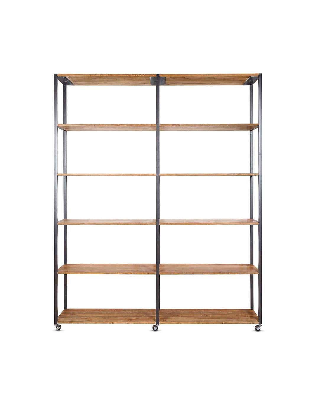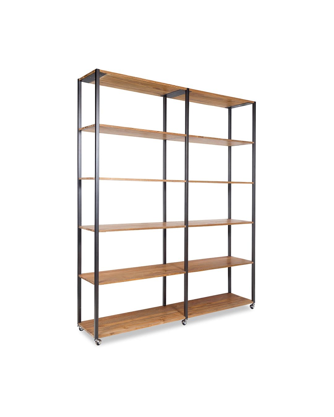 Estantería XL. Sus dúo de materiales protagonistas, la teca reciclada y el hierro, son el equipo imbatible que necesitas en un mueble de almacenaje. Con sus más de dos metros de alto, la estantería XL combina a la perfección funcionalidad y diseño, con un total de seis espaciosos estantes resultado de una estructura minimalista, simétrica y moderna, de aires industriales y estilo nórdico. La teca reciclada, recuperada de antiguas construcciones en desuso en Java, Indonesia, convierten este producto en un mueble sostenible con mucha presencia, que será un gran complemento para cualquier estancia. Además, tiene ruedas para facilitar su transporte. ¡La estantería XL lo tiene todo!