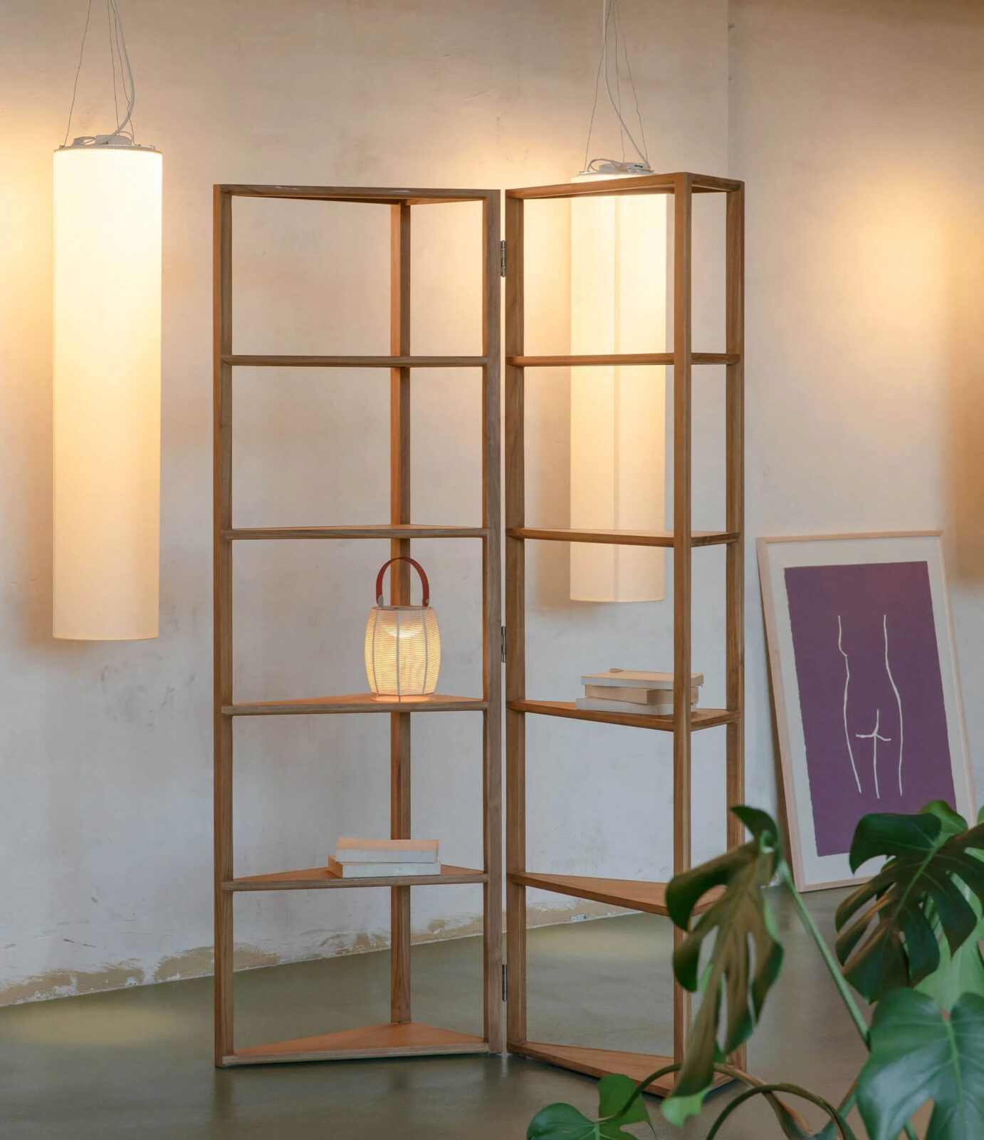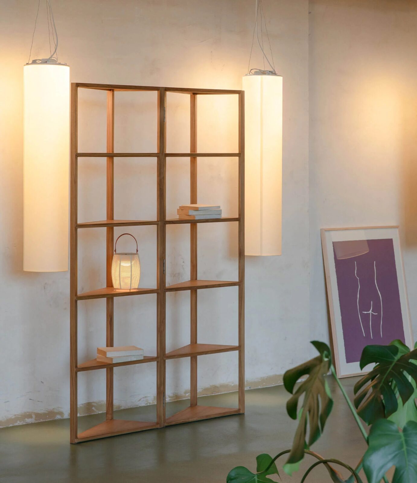 Estantería modular ZIG de teca maciza, 50 cm x 30 cm. Dos versiones: altura 128 cm y 170 cm. Con bisagras para varios formatos.