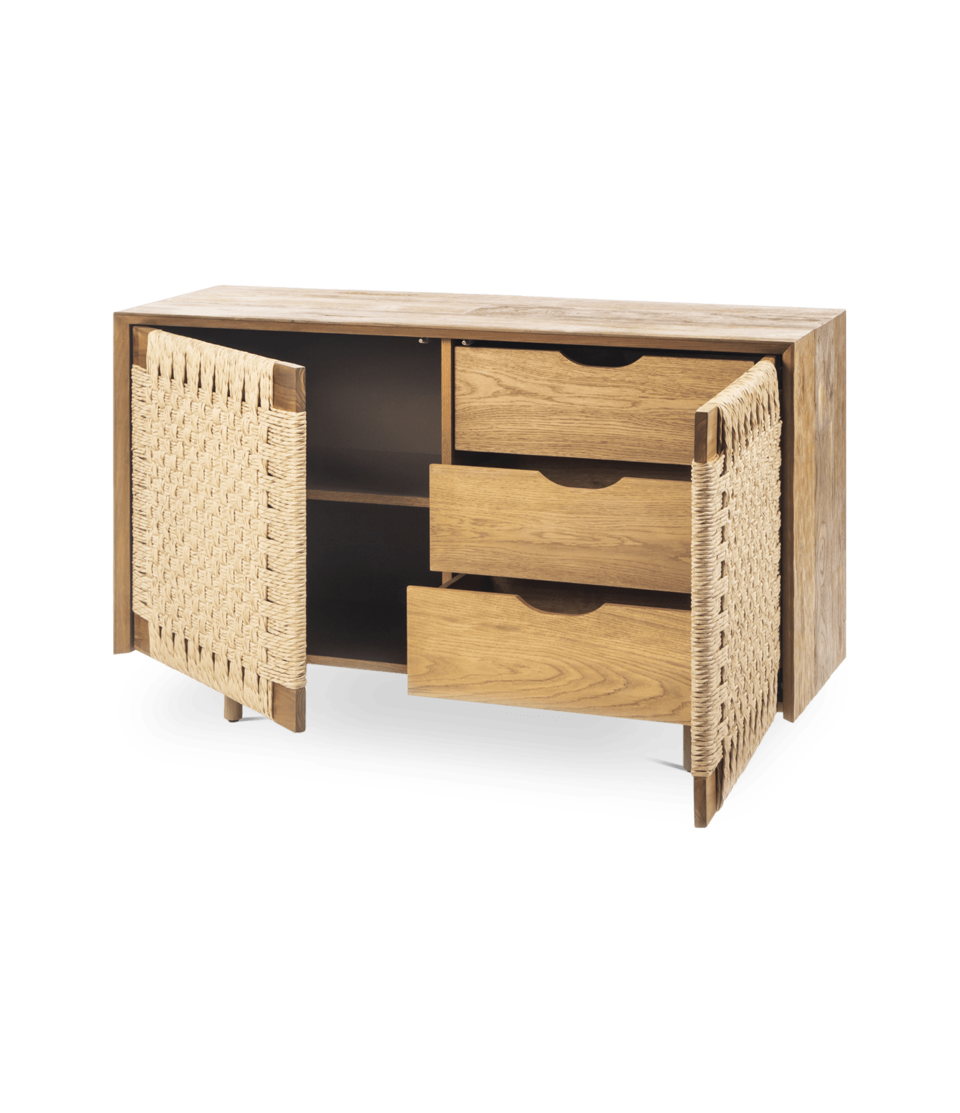 Bufete VIROTEC, teca reciclada maciza y ratán sintético, interior de roble y color siena, patas de teca.