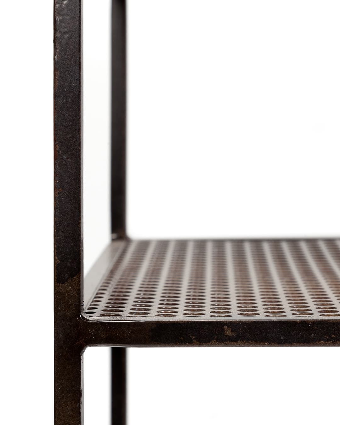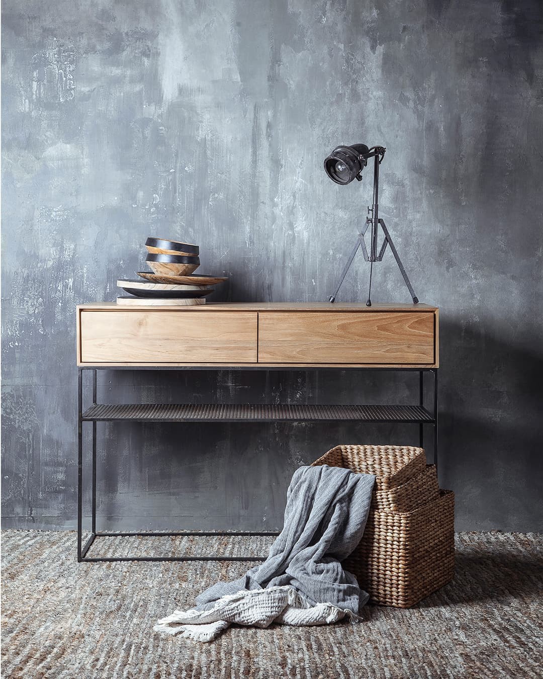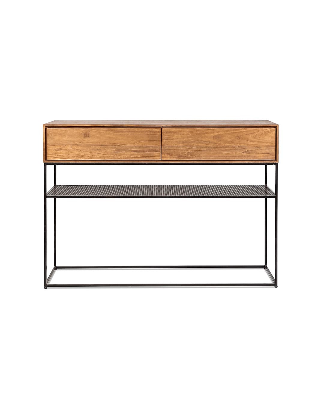 La consola ONETWO ofrece una estructura de perfil cuadrado de hierro macizo incorpora, en esta ocasión, una plancha metálica perforada como balda a media altura. En la parte superior, descansa un amplio cajón de madera de teca, cuyo borde frontal ha sido cuidadosamente rebajado hasta apenas un centímetro para estilizar y aportar ligereza al diseño. En su interior, dos cajones de considerable capacidad, se abren y cierran con precisión gracias al sistema push to open & soft close.