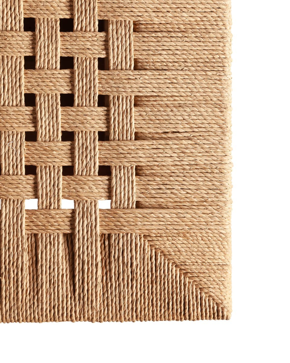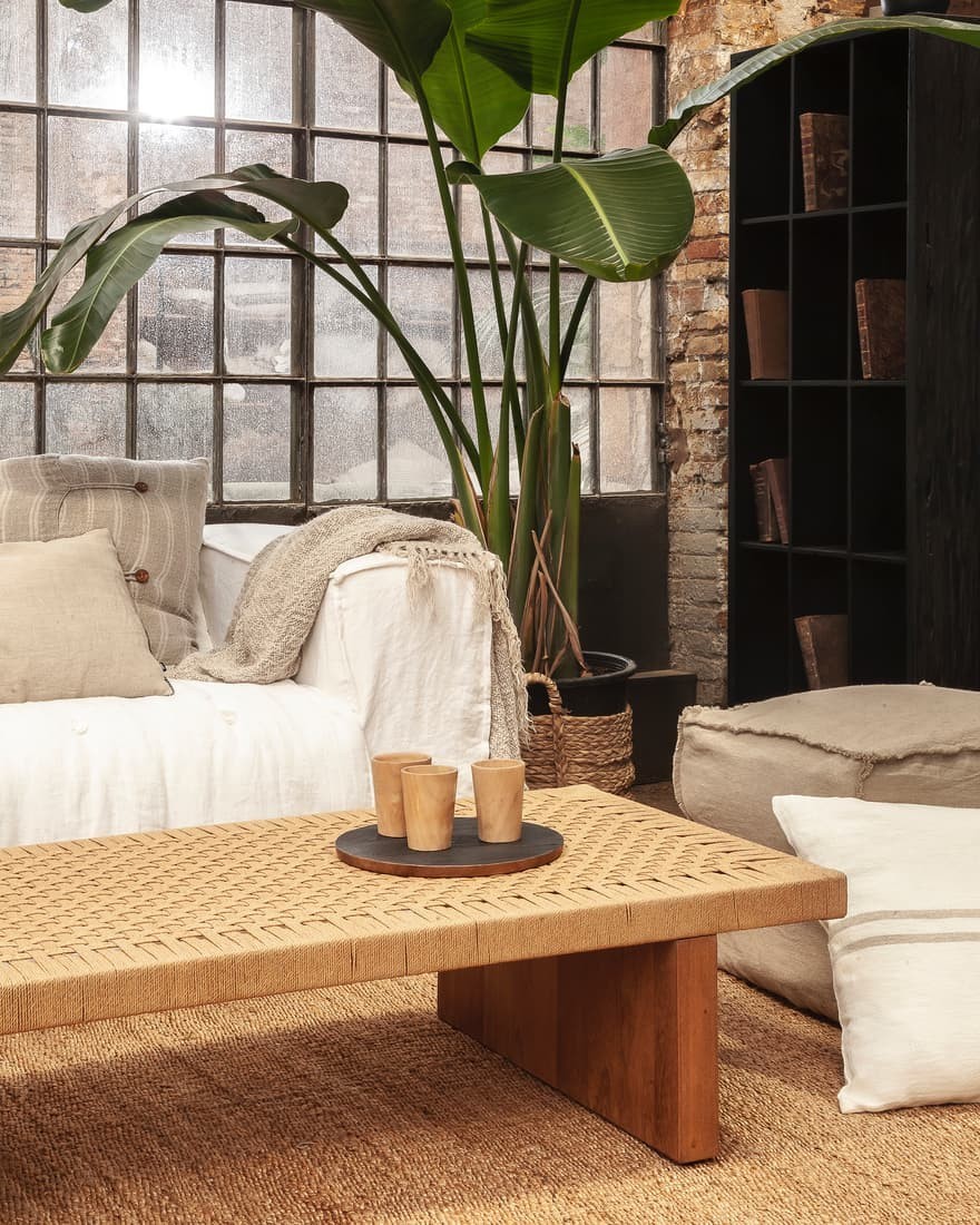 Mesa de centro CORA 150, de madera teca reciclada natural, fabricada de materiales totalmente sostenibles. El tejido de cuerda, junto a la estructura de teca natural recuperada de antiguas construcciones en desuso en Java.